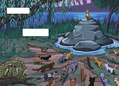 RiverClan cats live in a wet marshland with a big river that extends from the lake at the center of all the Clans. There are wet grasses, cattails, and few trees. The river has a rocky bed with rocks that extend past the surface of the streaming water. RiverClan's territory is closest to the island in the lake where the Clans hold Gatherings. RiverClan shares borders with ShadowClan and the horseplace, where twolegs sometimes keep horses. There is a strip of land that connects to WindClan's territory. RiverClan cats's diet consits of mostly fish from the stream and land prey if absolutely necessary.